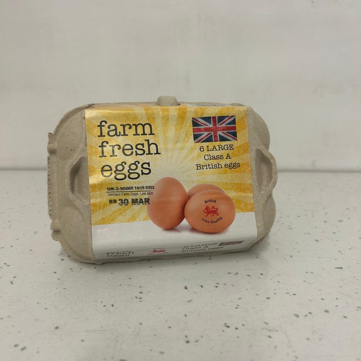 Half a dozen fresh large eggs all stamped with the date and lion seal of quality. All our eggs are packed at Kenyons farm in Preston, Lancashire.